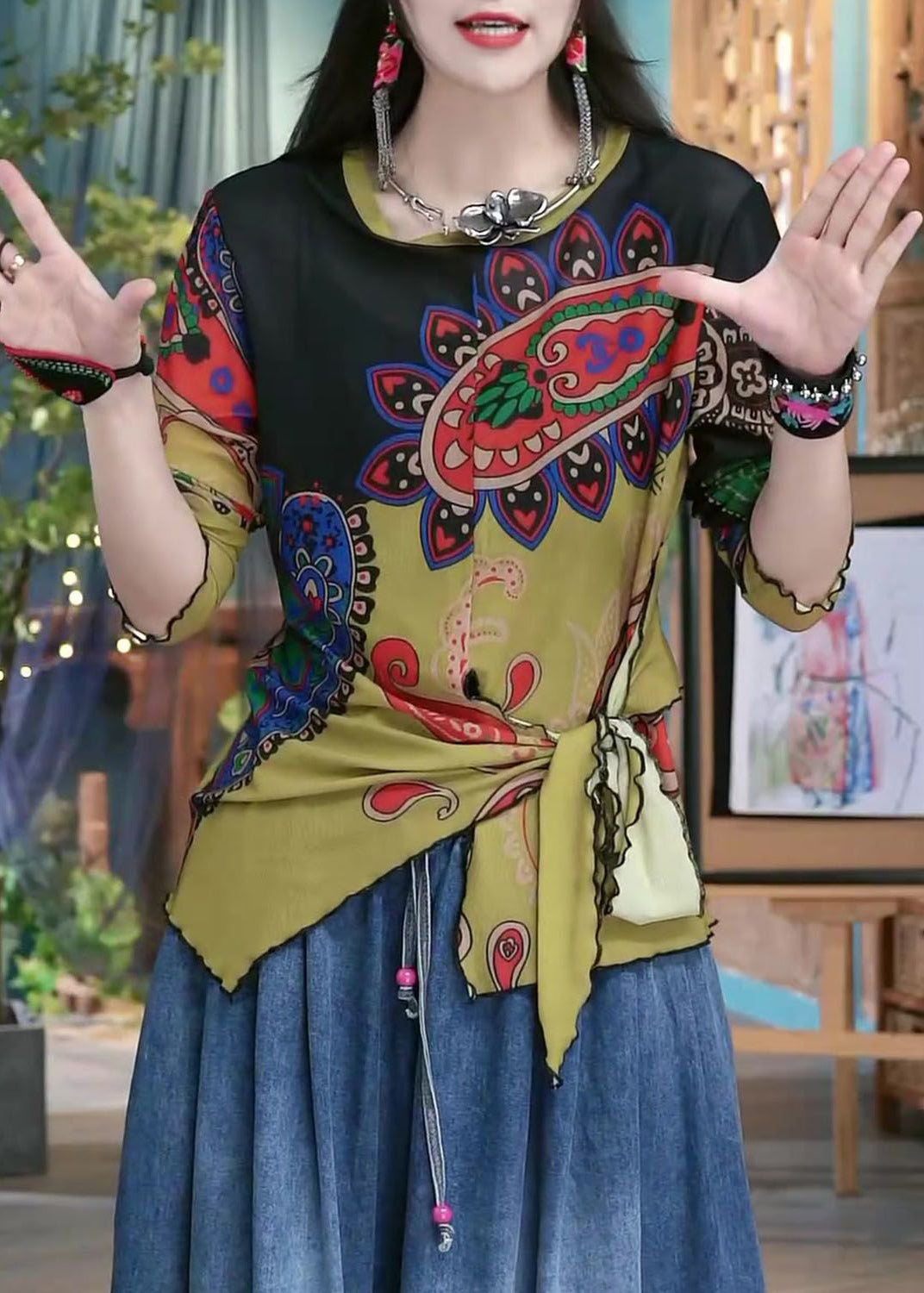 Damen-Top mit Farbblock-Print und Schnürung, Baumwolle, langärmlig