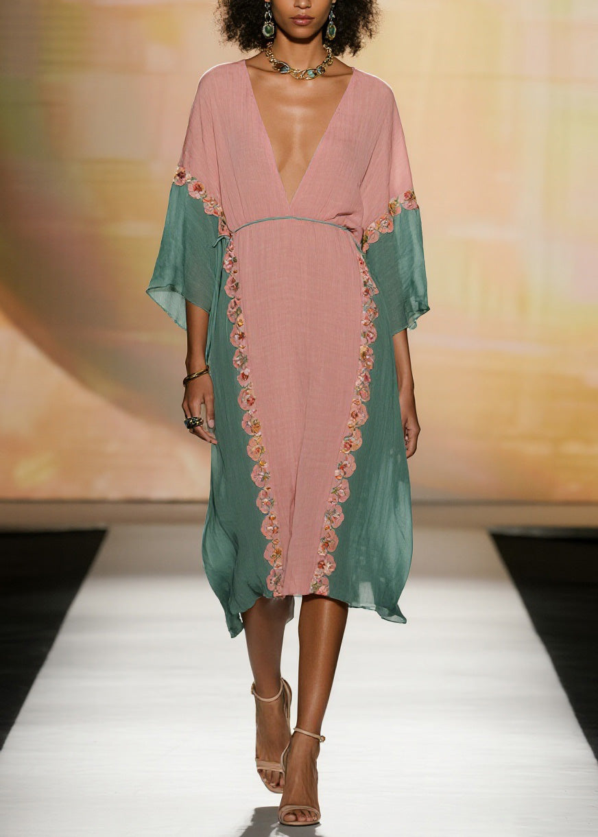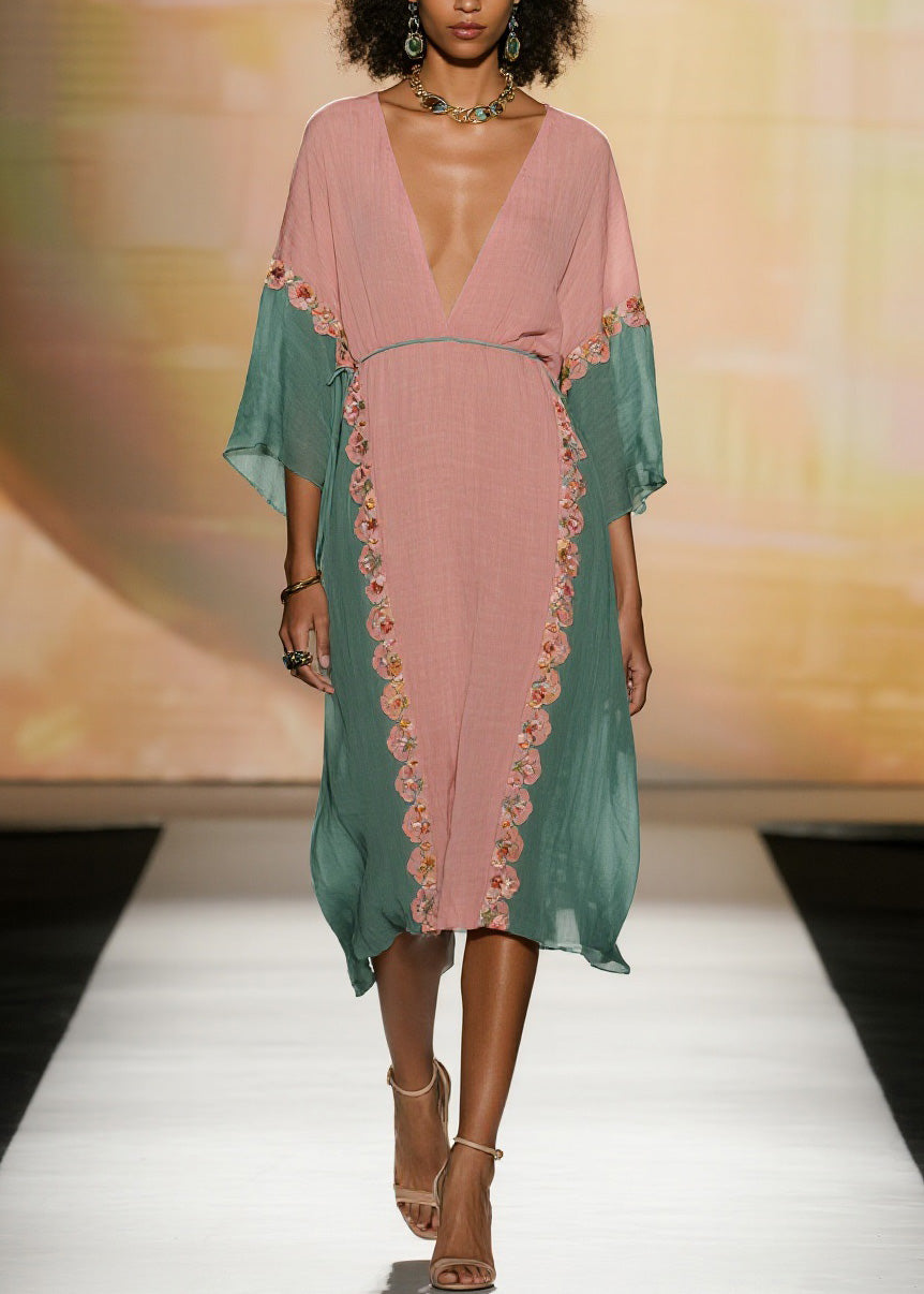 Women Colorblock V Neck Floral Cotton Dress Summer