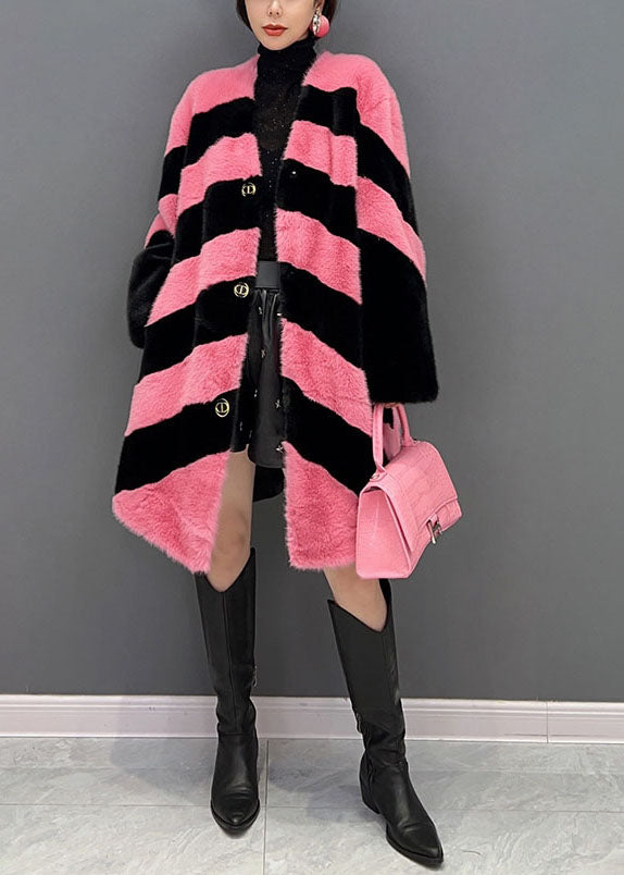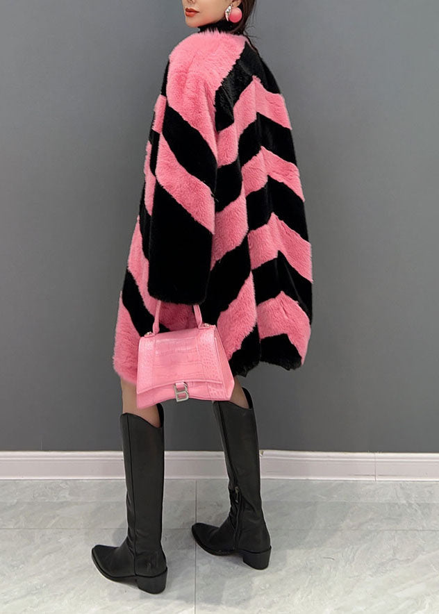 Frauen Colorblock V-Ausschnitt gestreift dick Nerz Samt Mantel Winter