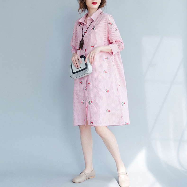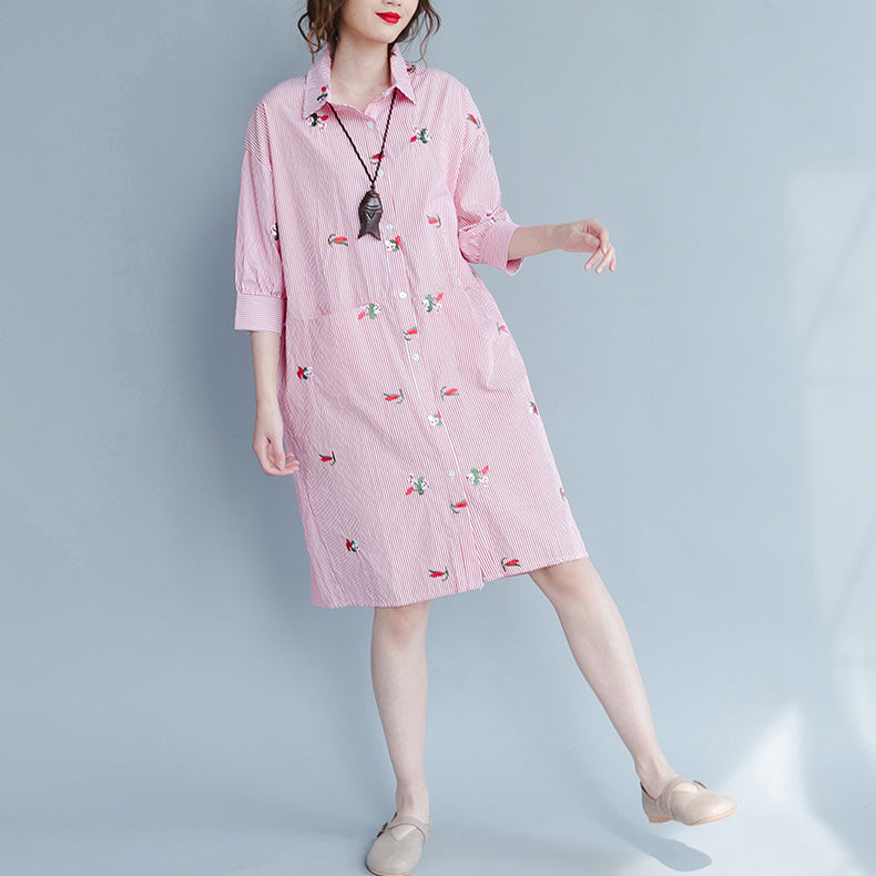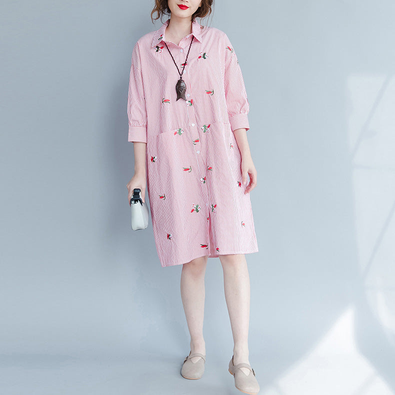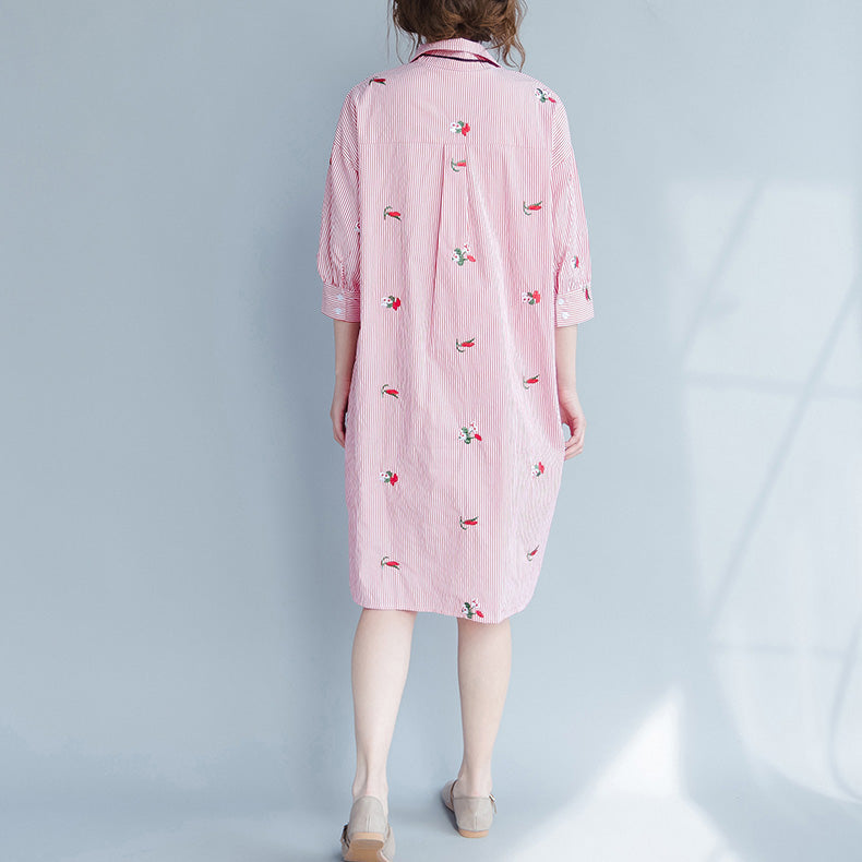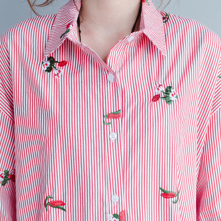 Damenmode Bestickte Blusen Lange Gestreifte Tops T-Shirts Lässige Lose Tuniken