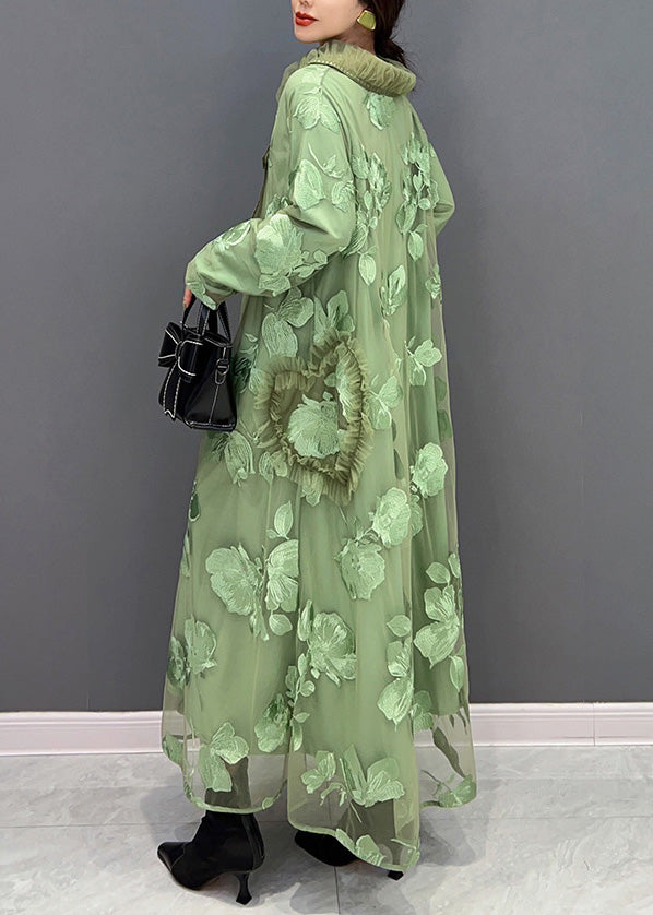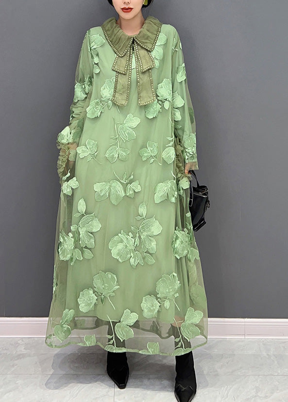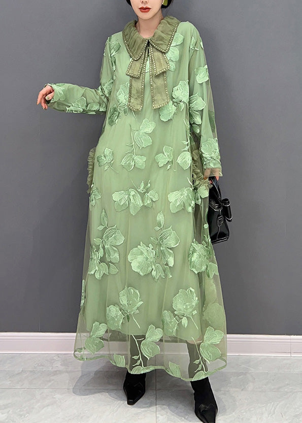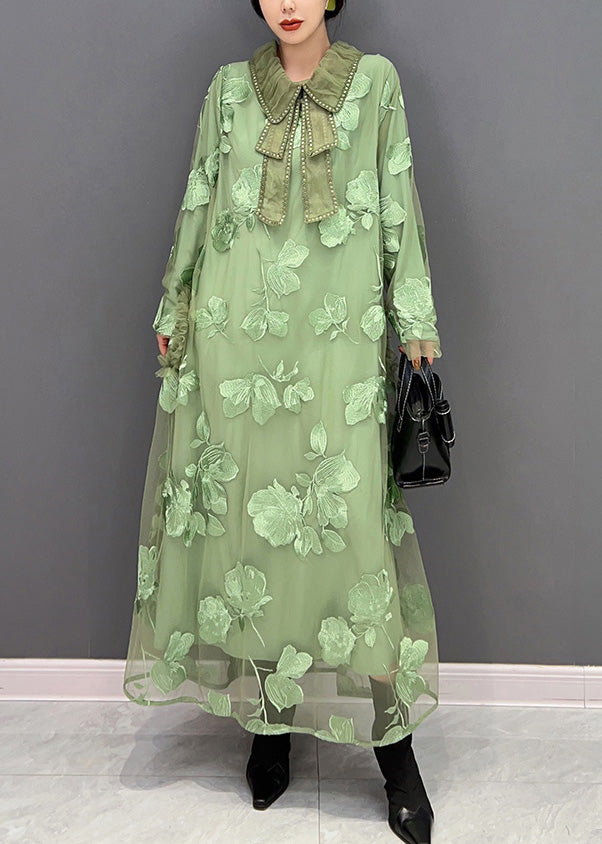 Frauen Grün Peter Pan Kragen Bestickt Patchwork Tüll Lange Kleider Langarm
