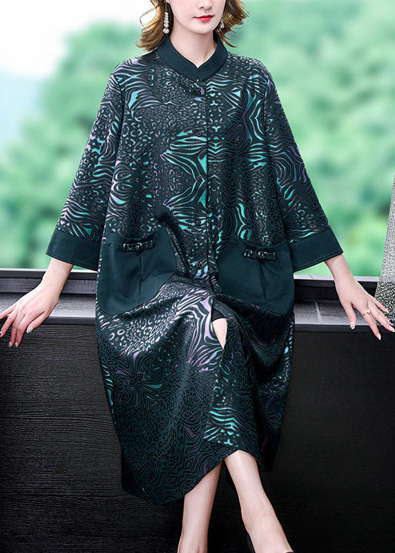 Frauen Grün Stehkragen Taschen Print Seide Trenchcoat Frühling