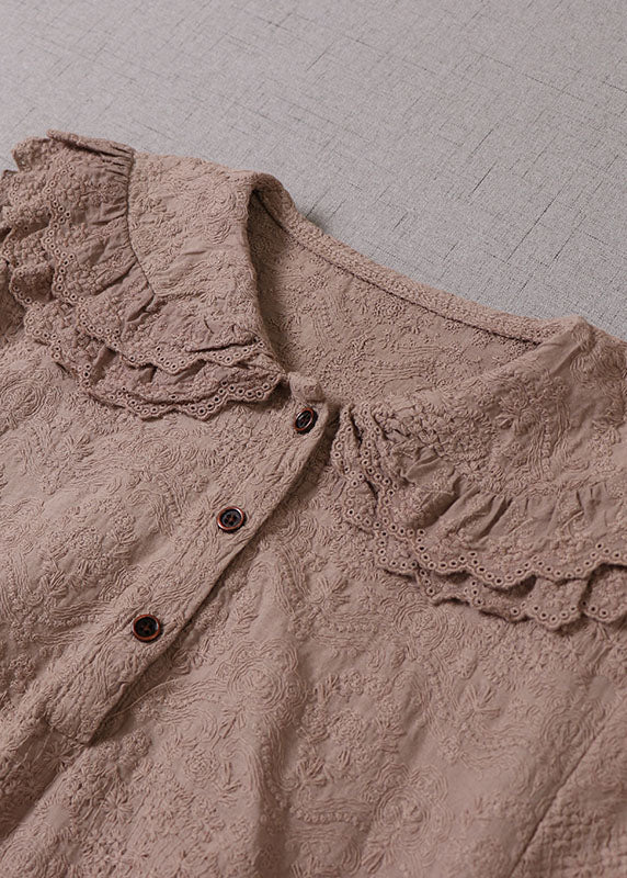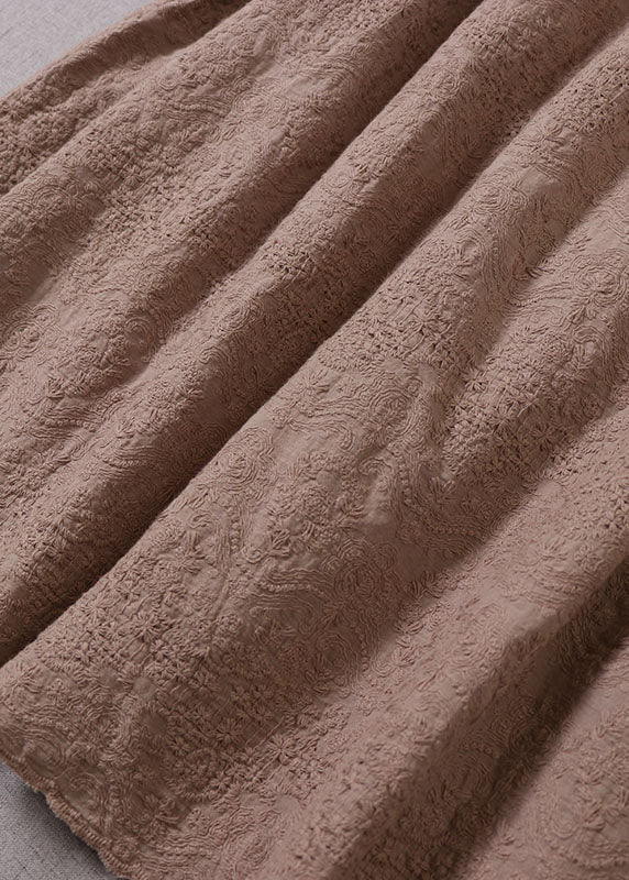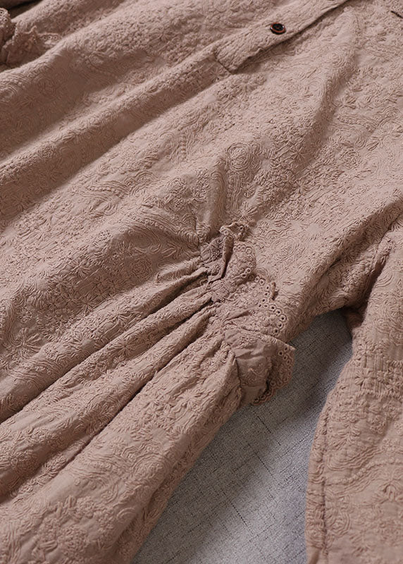 Frauen Khaki Bestickte Rüschen Baumwolle Urlaub Kleider Langarm