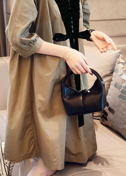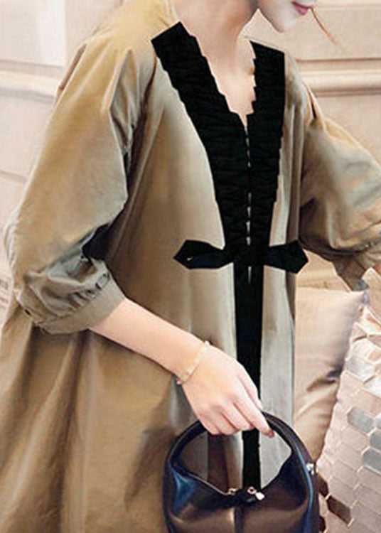Damen Khaki V-Ausschnitt Schleife Casual Herbst Halbarm Shirts Kleid