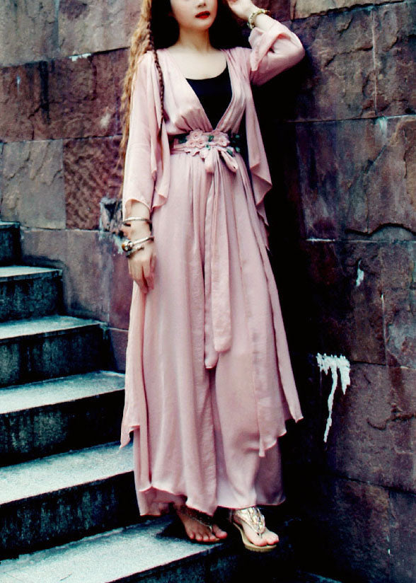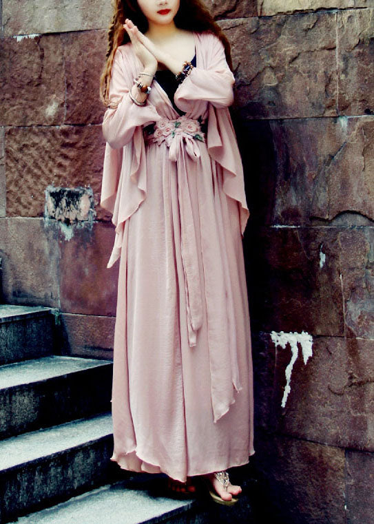Frauen Hellrosa V-Ausschnitt Asymmetrische Extra Große Saum Seide Strand Cinch Kleid Frühling