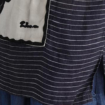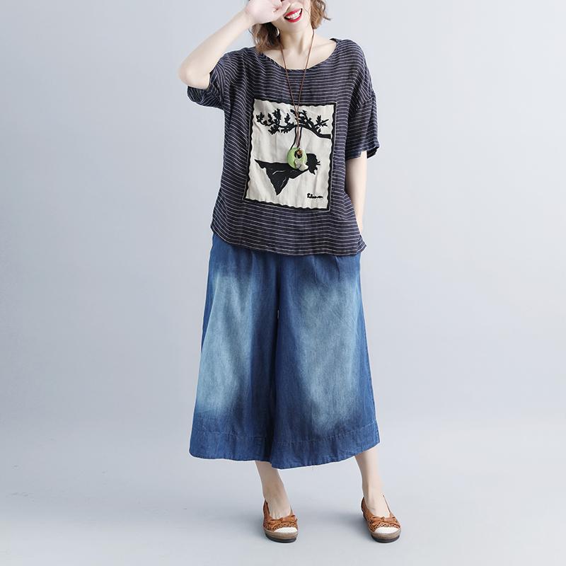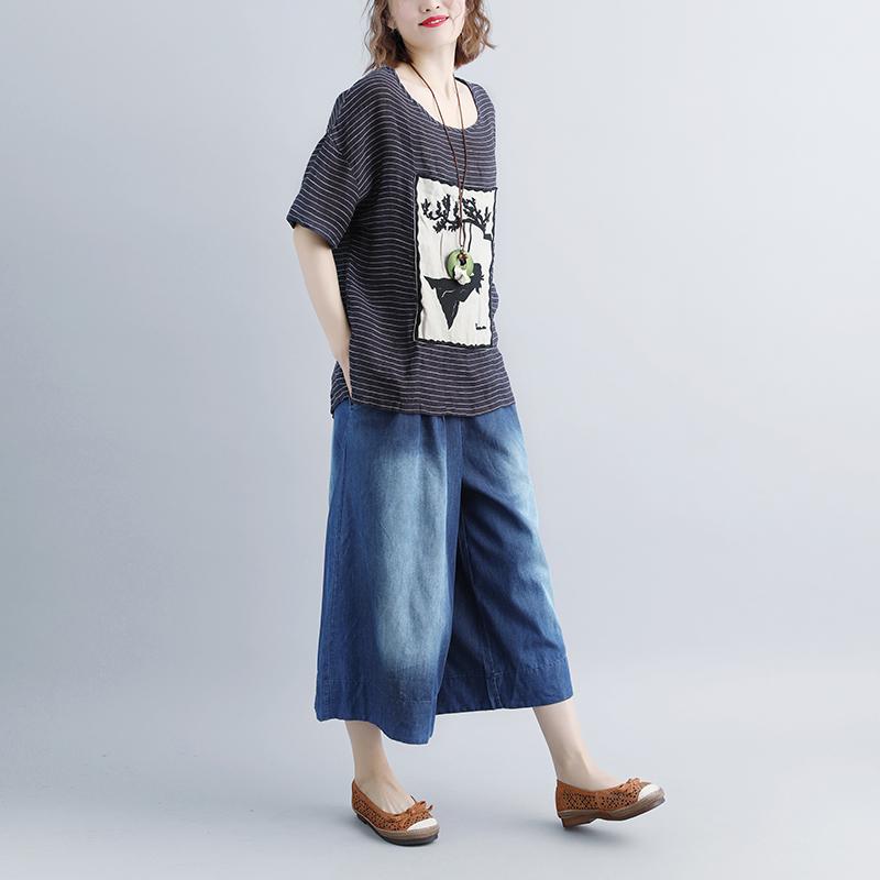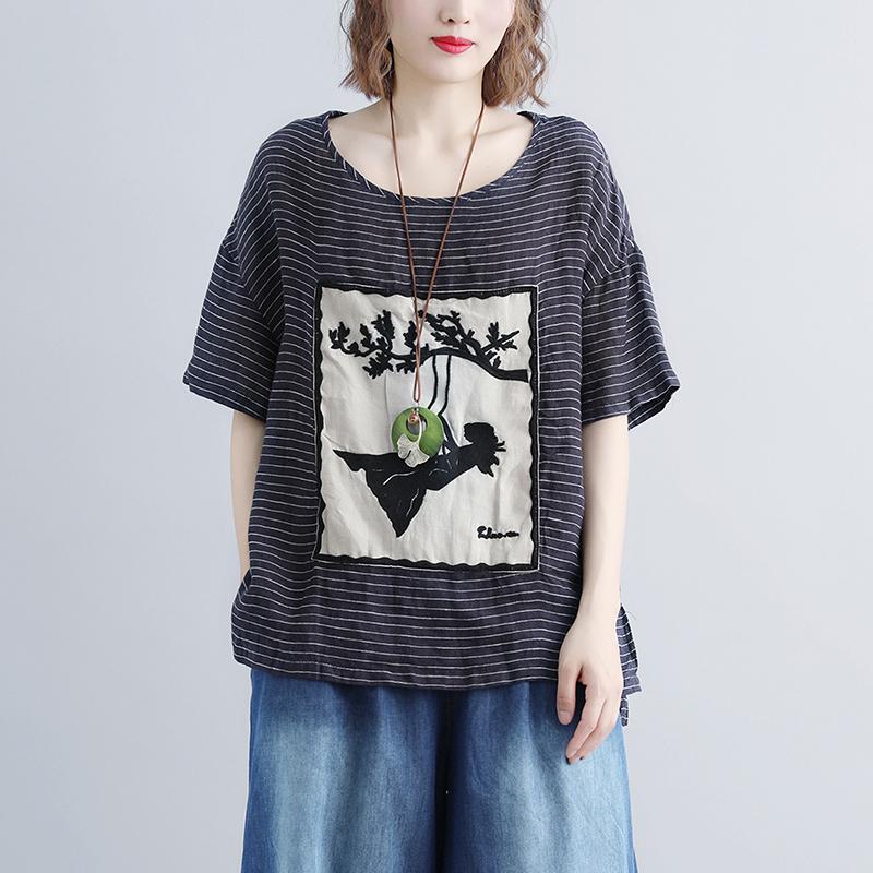 Damen-Oberteile aus reinem Leinen, übergroß, lässig, gestreift, kurzärmlig, Stickerei, High-Low-Saum