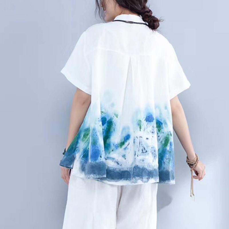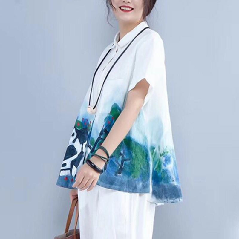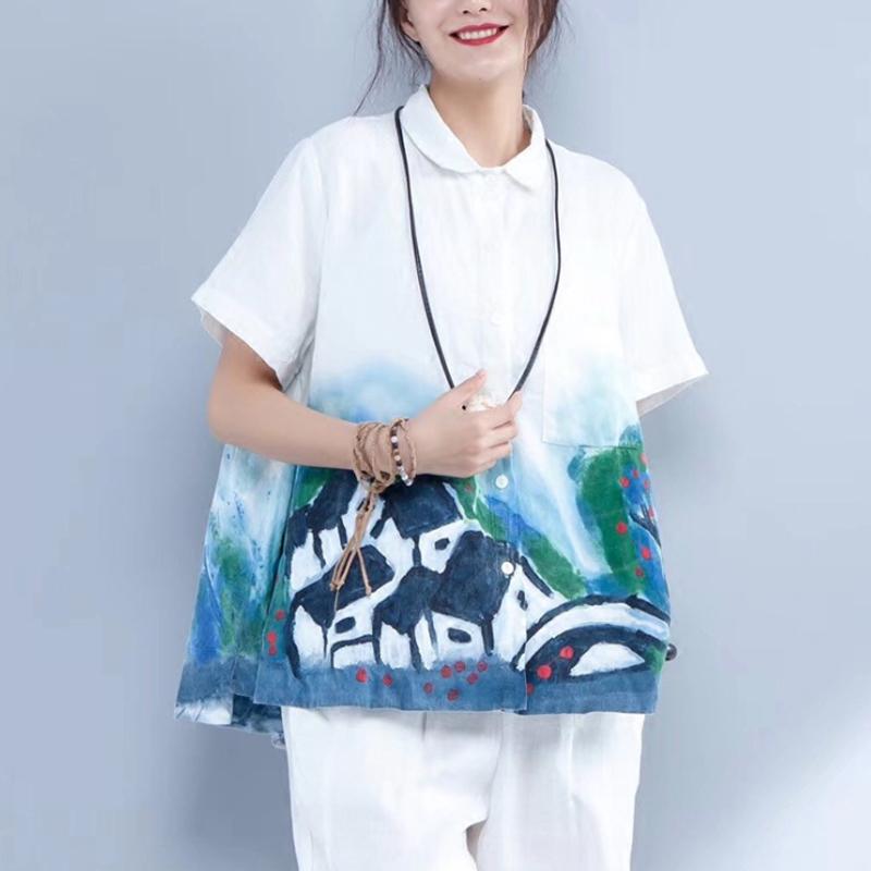 Damen Sommer Leinen Tops Locker sitzende Druck Leinen Lose Tasche Weiße Bluse