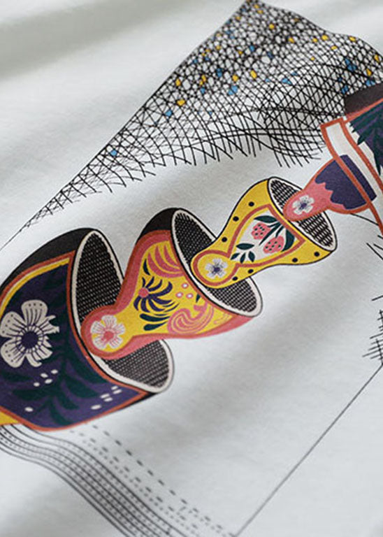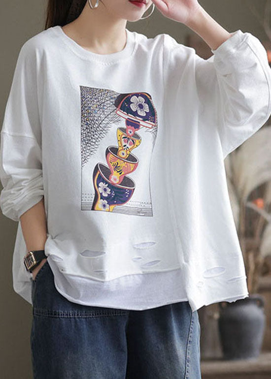 Damen Weißer O-Ausschnitt Loch Print Baumwolle Pullover Sweatshirt Langarm
