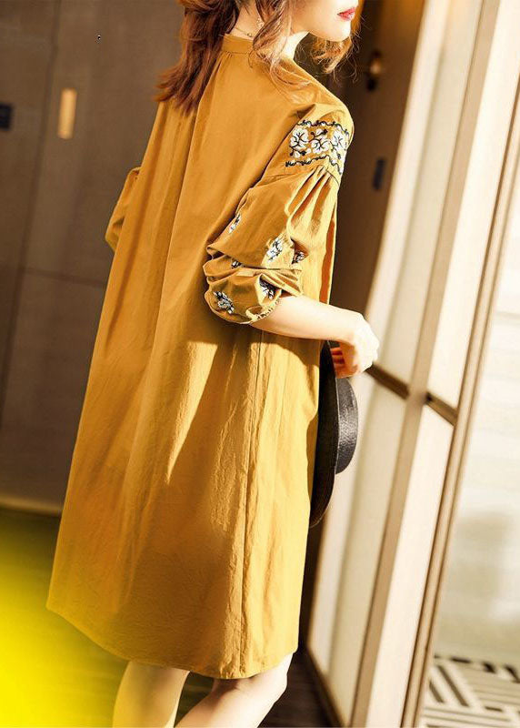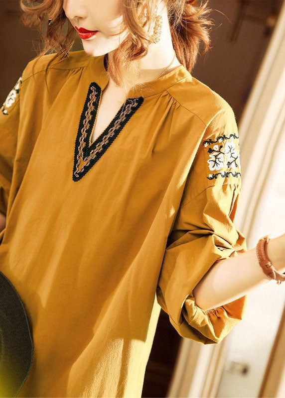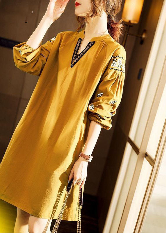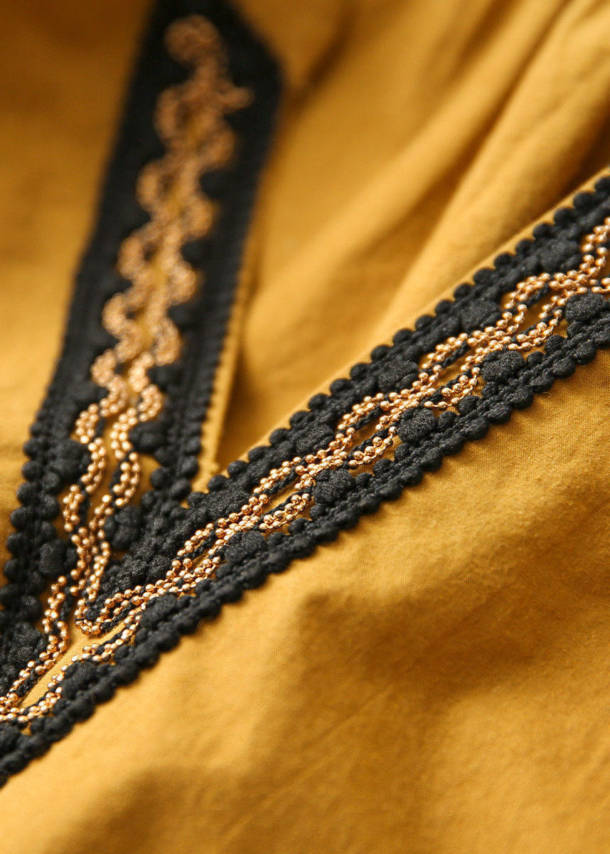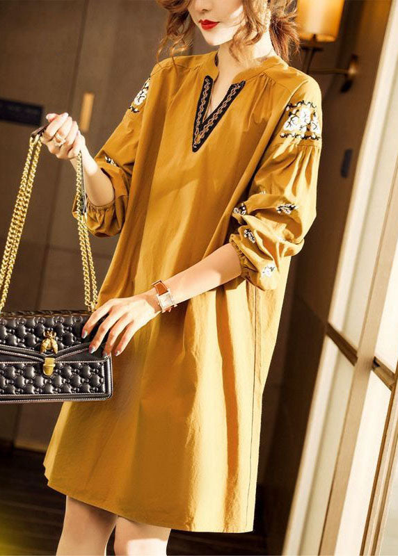 Gelbe V-Ausschnitt Mode Baumwolle Kleider Frühling